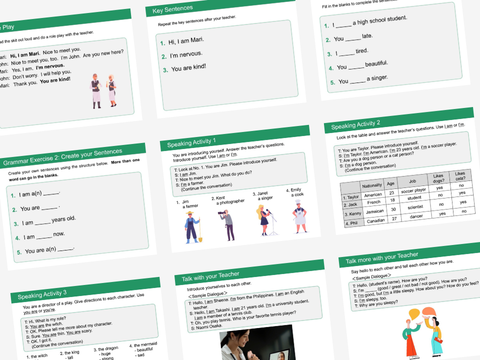 Trong mỗi bài học đều có các mẫu ngữ pháp tiếng Anh mục tiêu và tài liệu giảng dạy được thiết kế để có thể học "tiếng Anh có thể sử dụng và nói được" trong thực tế cuộc sống hàng ngày. Thay vì học tiếng Anh không rõ mục đích hoặc hội thoại với giáo viên bằng cách chỉ sử dụng vốn tiếng Anh sẵn có, bạn có thể vừa từng bước cải thiện kỹ năng cơ bản, vừa phát triển kỹ năng nói trong mỗi bài học. Cùng với sự tiến triển của bài học, bạn sẽ cảm nhận được nội dung bản thân có thể nói được bằng tiếng Anh dần tăng lên, vì vậy, việc bạn có thể giữ được động lực đối với việc học tiếng Anh và học tập một cách vui vẻ cũng là một sức hấp dẫn to lớn.